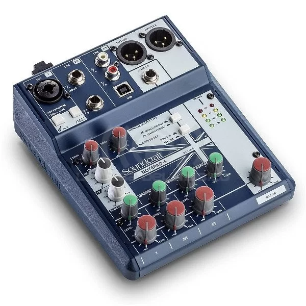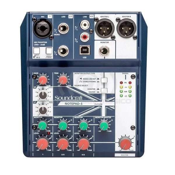 Mezclador compacto Soundcraft Notepad-5 de 5 canales con interfaz I/O USB 2×2: El Notepad-5 de Soundcraft es una consola de mezcla analógica de 5 canales de formato pequeño con una interfaz de audio USB 2×2 integrada muy adecuada para producción musical podcasts producción de video entrevistas ensayos sesiones de escritura y eventos móviles El mezclador combina componentes analógicos de nivel profesional como un preamplificador de micrófono con una entrada combinada XLR-1/4 ecualizador de 2 bandas y un filtro High-Pass de 100 Hz Además la entrada 1 ofrece una entrada Hi-Z para poder incorporar guitarras y otros instrumentos de alta impedancia Los canales 1-3 incluyen controles de ganancia/recorte un envío de monitor y controles de nivel Los canales 2/3 utilizan entradas de nivel de línea de 1/4 mientras que los canales 4/5 incluyen entradas estéreo RCA Las salidas incluyen Master L / R en XLR un envío de monitor de 1/4 y una salida de monitor dedicada de 1/4 botón para seleccionar entre salida de línea mono o salida de auriculares estéreo La sección maestra ofrece una perilla de control maestra y cuatro medidores LED con -20 0 y6 dB y ajustes de Peak El Notepad-5 presenta una carcasa metálica duradera y se envía con Una fuente de alimentación externa Sonido de calidad Soundcraft desde el preamplificador para micrófono profesional Graba edita y reproduce fácilmente desde tu computadora Mac o Windows con una interfaz de audio USB integrada Simplemente conéctalo a tu Mac (las computadoras con Windows requieren la instalación del controlador Soundcraft) Obtener una gran mezcla es fácil con un diseño familiar y amigable de canales que incluye EQ envío de monitor nivel maestro y control giratorio de volumen de auriculares Fabricación robusta en metal para gran durabilidad